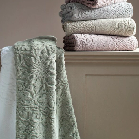 Sim, a linha inclui também toalha de rosto e piso, todos com o mesmo padrão leve e tecnológico.